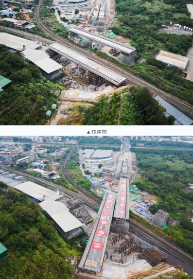 當天7時(shí)04分,轉體橋梁開(kāi)始轉體,經(jīng)過(guò)44分鐘施工,成功完成高空“二人轉”,為下一步順利實(shí)現通車(chē)運營(yíng)奠定堅實(shí)基礎。轉體橋上跨既有漳龍線(xiàn)、龍東線(xiàn)及煤場(chǎng)專(zhuān)用線(xiàn)3條鐵路貨運營(yíng)業(yè)線(xiàn),距離營(yíng)業(yè)線(xiàn)最近距離僅5.9米,施工難度大,危險系數高。