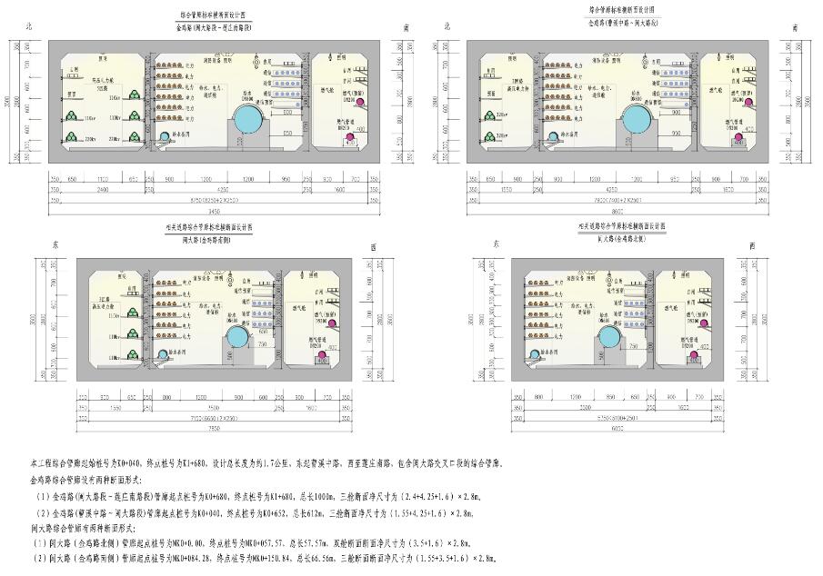 :①斷面凈尺寸為(2.4十4.25十1.6)×2.8M,艙內管線(xiàn)有:給水管(管徑DN800)、通信管(16孔,含電信管、交通電纜及有線(xiàn)電視電纜)、電力管(30孔)、2回22KV高壓電力、3回110KV高壓電力及管廊自用電力管,并預留—定空間。②斷面凈尺寸為(1.55十4.25十1.6)×2.8M,艙內管線(xiàn)有:給水管(管徑DN800)、通信管(16孔,含電信管、交通電纜及有線(xiàn)電視電纜)、電力管(30孔)、2回22KV高壓電力、3回110KV高壓電力及管廊自用電力管,并預留—定空間。工程總投資10500萬(wàn)元。
