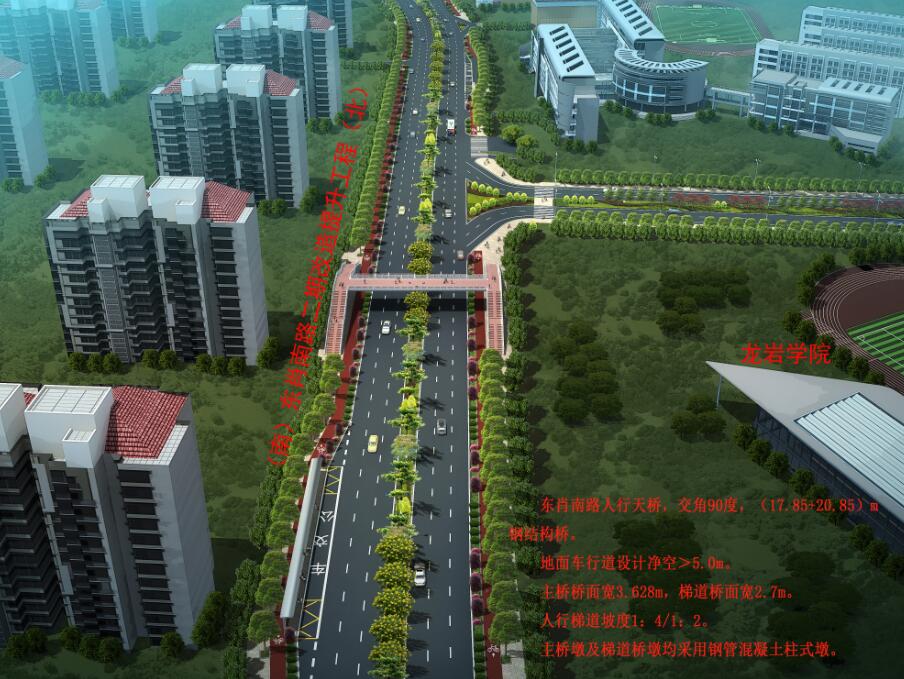 龍巖學(xué)院人行天橋位于龍巖學(xué)院大門(mén)北側約50米處,天橋采用“工”字形設計,橋面長(cháng)40米、寬3.6米,兩側梯道坡度為1:4和1:2,跨度分別為17.85米和20.85米,寬2.7米,主橋墩及梯道橋墩均采用鋼管混凝土柱式墩,總投資約450萬(wàn)元。