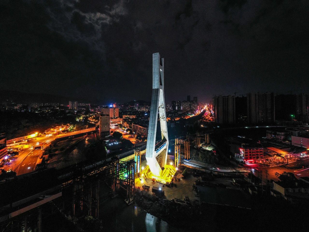 龍巖大橋主塔今日凌晨完成第一次轉體